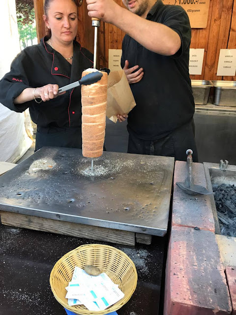 Next to the Thermal Baths, there was a lot of tents and stations set up where people were selling food. I shared some beef with Levi, and for dessert we got some Donuts. Oma tried a new thing that they eat for dessert in Budapest called a chimney cake. It is basically a breaded dough, that they put on these rollers, and cook them under fire, then when they turn brown enough, then they take it off and put sugar and a flavor on it. It was not as good as I thought it would taste.